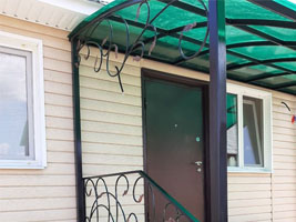 Оформление входа в дом — визитная карточка фирмы или домовладельца. Кованые навесы и козырьки над крыльцом дома — конструкция многофункциональная. Они одновременно украшают фасад, неся эстетическую функцию и защищают входную зону от попадания осадков и воздействия прямых солнечных лучей, продлевая срок эксплуатации входной двери. Козырьки размещаются непосредственно над крыльцом.